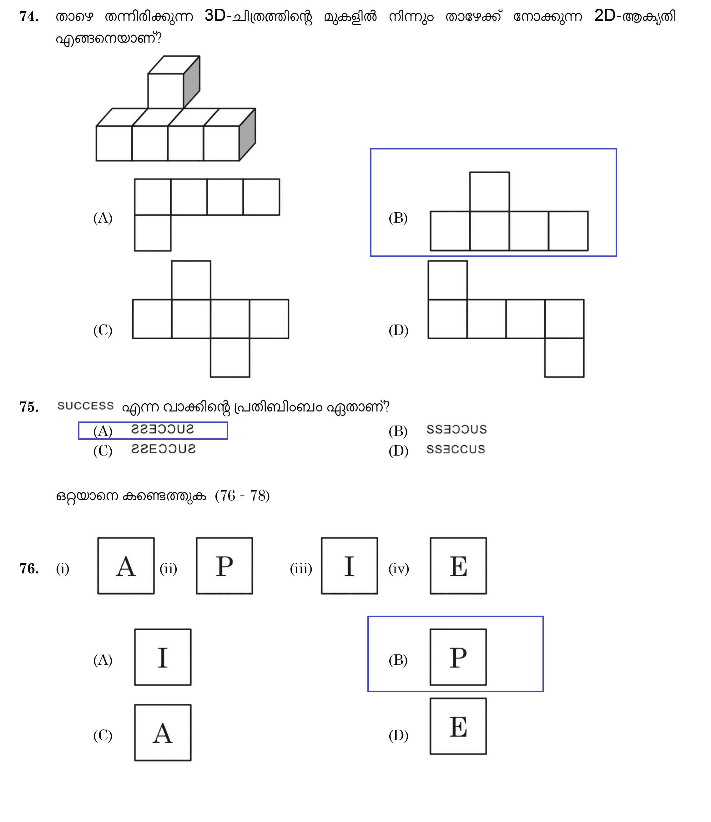 72. ഒരു സമചതുരക്കട്ടയുടെ താഴെക്കൊടുത്തിരിക്കുന്ന ചിത്രങ്ങളെ അപഗ്രഥിച്ചതിനുശേഷം അടിവശത്ത് 4 എന്ന അക്കമാണെങ്കിൽ മുകൾ വശത്ത് ഏതക്കമായിരിക്കും?